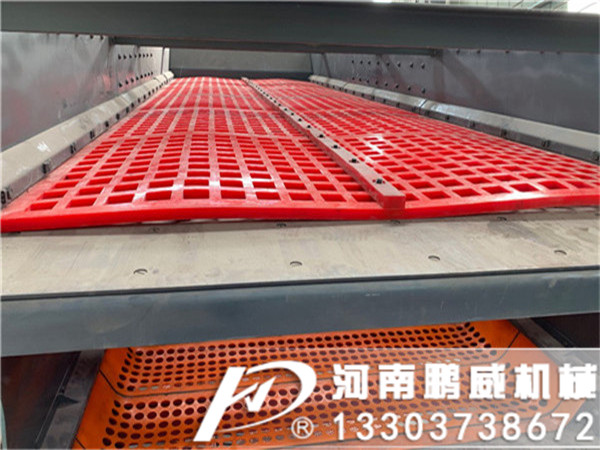弛張篩是我廠生產(chǎn)的一種新型篩分機械。該機采用雙質(zhì)體亞共振原理,通過傾斜篩箱上安裝的彈性篩面的弛、張運動拋擲物料的篩分機。其主要特點是篩分效率提高,處理量大,動負荷小,功耗少,噪聲低,因此應(yīng)用較為廣泛。在這個過程中,彈性聚氨酯篩面以每分鐘800次的頻率連續(xù)不斷地擴張、收縮,從而獲得很高的加速度(50g),可處理6mm以下的粘性難篩分的物料,采用獨特的雙重振動原理,即通過共振幫助,使一個基本橢圓振動帶動了其他的一層或多層的浮床曲張,并且浮床曲張振動的振幅遠大于傳統(tǒng)的振動設(shè)備的振幅,有效地防止了篩孔堵塞。弛張篩是雙質(zhì)量振動系統(tǒng),采用聚氨酚橡膠篩面,支承篩面的任意兩根相鄰橫梁都分別屬于兩個振動質(zhì)體,其中一個質(zhì)體是篩箱,另一個質(zhì)體是配重。在工作時,篩網(wǎng)交替地拉緊和松弛,使物料產(chǎn)生前進彈跳運動,可避免物料黏附篩網(wǎng)并堵塞篩孔。當兩質(zhì)體相差二相位振動時,任意兩根相鄰橫梁時而靠近,時而遠離,彈性篩面也相應(yīng)時而松弛,時而張緊,即篩面隨篩箱作牽連運動的同時,還相對篩箱作相對運動。這種弛張運動不僅使篩孔不斷產(chǎn)生變形,而且大大增加了篩面的振動強度,從而有效地克服了篩孔堵塞現(xiàn)象,顯著提高了篩機處理能力。但是因篩箱的振動強度并不大,故機械強度容易保證,但篩面的振動強度較大且反復(fù)變形,故篩面壽命較低。根據(jù)料群運動自身規(guī)律性,鵬威弛張篩可有效的使?jié)裾澄锪蠈铀缮ⅰ⒎謱雍屯负Y。